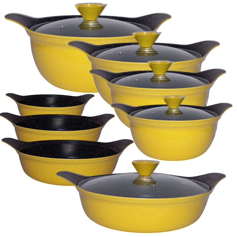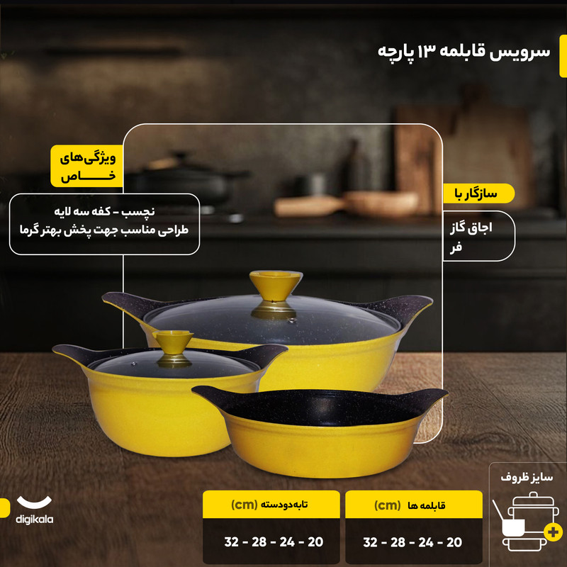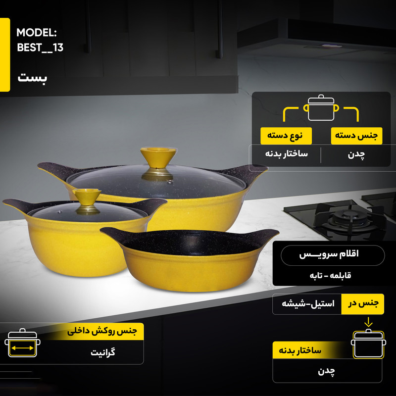 سرویس قابلمه 13 پارچه Best مدل 13BEST مجموعهای کامل از ظروف پخت و پز چدنی است که برای آشپزخانههای حرفهای و منزل طراحی شده و تولید آن در داخل کشور صورت گرفته است. این مجموعه شامل چهار قابلمه همراه با درب در سایزهای 20، 24، 28 و 32 سانتیمتر، یک تابه دربدار 32 سانتیمتری و سه تابه بدون درب در ابعاد 20، 24 و 28 سانتیمتر است. بدنهی این ظروف از چدن ساخته شده و با پوشش نوگرانیت نچسب ترکیبی پوشانده شده که مقاومت بالایی در برابر خط و خش دارد. لایه داخلی ترکیبی از نانو چدن و گرانیت بوده، سطحی کاملاً نچسب و مقاوم فراهم کرده و کیفیت پخت را ارتقا داده است. دستهها همرنگ با بدنه و از جنس چدن هستند؛ مقاومت بالا در برابر ضربه و دما دارند. کف سهلایه طراحی شده تا حرارت بهصورت کاملاً یکنواخت در سرتاسر بدنه پخش شود و روند پخت را بهینه کند. دربهای پیرکس همراه با سوپاپ تخلیه بخار مانع از سرریز غذا شده و استفاده از فر و پخت پنکیک را ممکن کرده است. پوشش خارجی رنگ استاتیک در برابر شعله مستقیم و تغییر رنگ مقاومت دارد. این سرویس قابلیت شستوشو بهصورت دستی و در ماشین ظرفشویی را دارد. تنوع سایز ظروف، طرح زیبا و کیفیت ساخت، آن را برای مصارف روزمره، حرفهای و حتی جهیزیه انتخابی جامع و مطمئن کرده است.